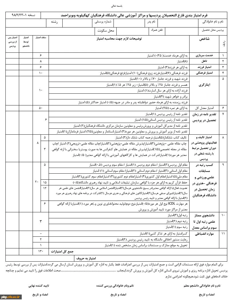 قابل توجه دانشجویان ورودی 1394: امتیاز بندی فارغ التحصیلان پردیسها و مراکز آموزشی عالی دانشگاه فرهنگیان کهگیلویه وبویراحمد 2
