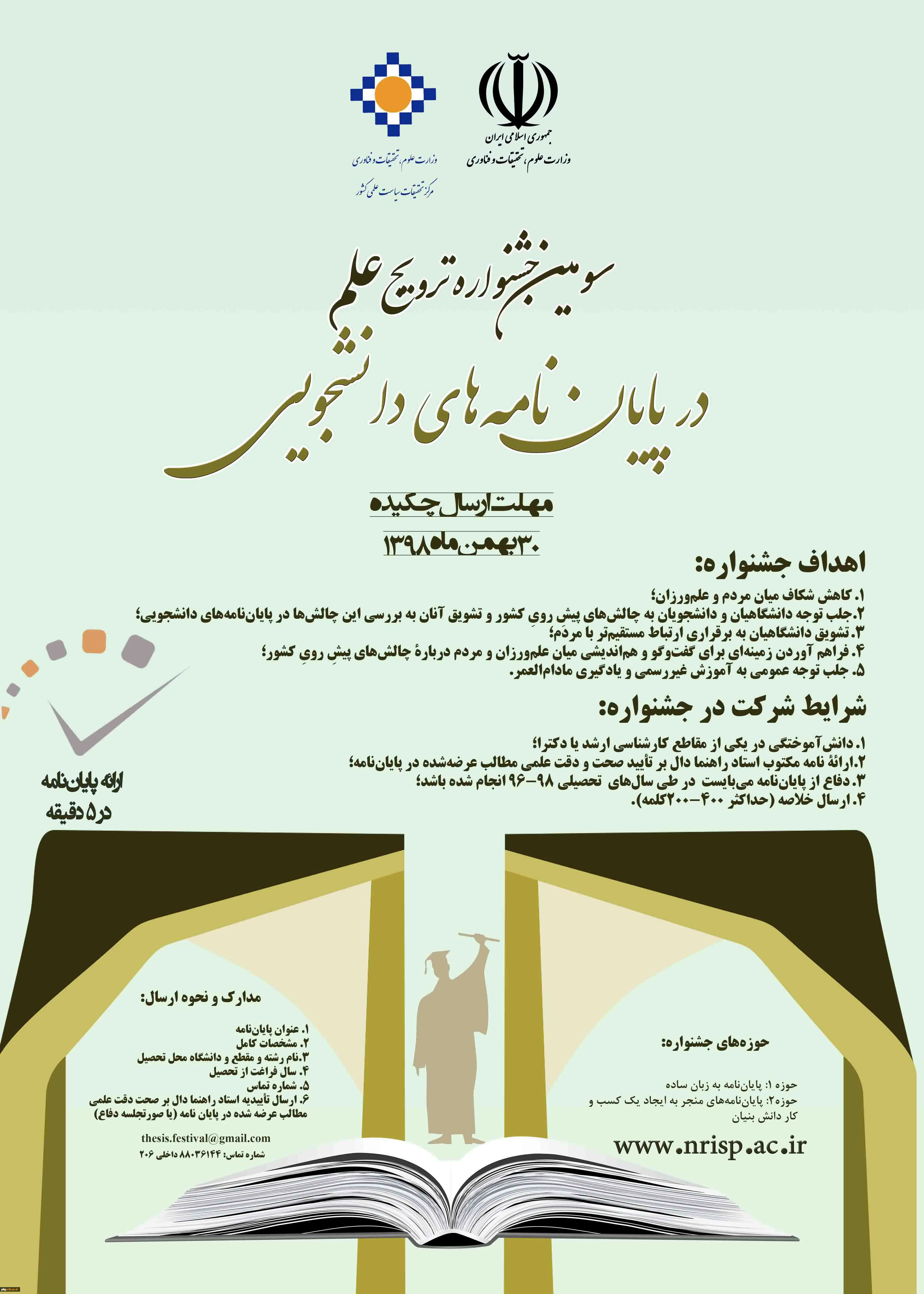 امتیاز دهید : فراخوان سومین جشنواره "ترویج علم در پایان نامه های دانشجویی" 2 دوشنبه 22 مهر 1398 ساعت 13:08