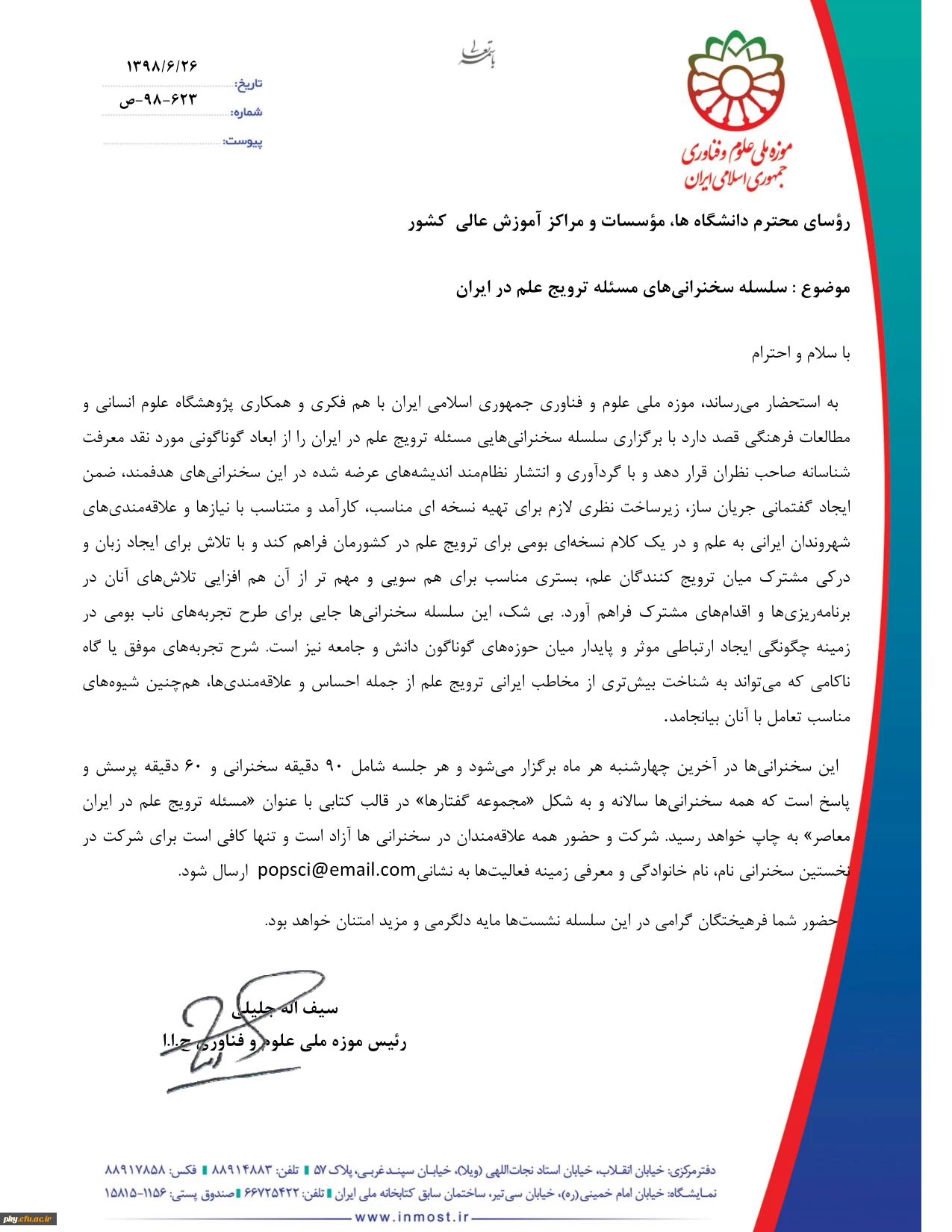 امتیاز دهید : فراخوان شرکت در سلسله سخنرانی های مساله ترویج علم در ایران معاصر 3 سهشنبه 21 آبان 1398 ساعت 16:00