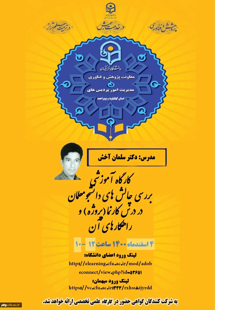 امتیاز دهید : کارگاه آموزشی بررسی چالش های دانشجویان در درس کارنما و راهکارهای آن 2 شنبه 14 اسفند 1400 ساعت 9:34